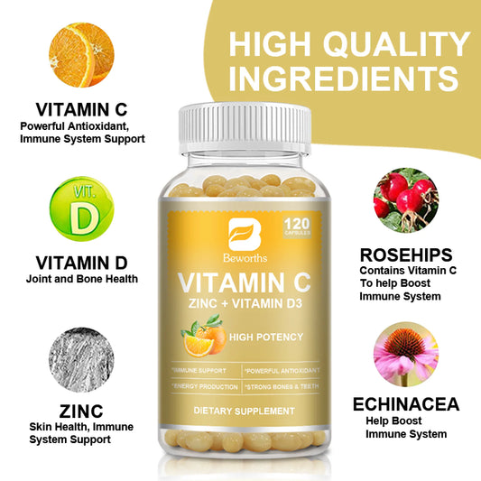 Vitamin C Zinc + Vitamin D3 Supplement, Plus Rosehips for Antioxidant & Immune Support, 120 Capsules