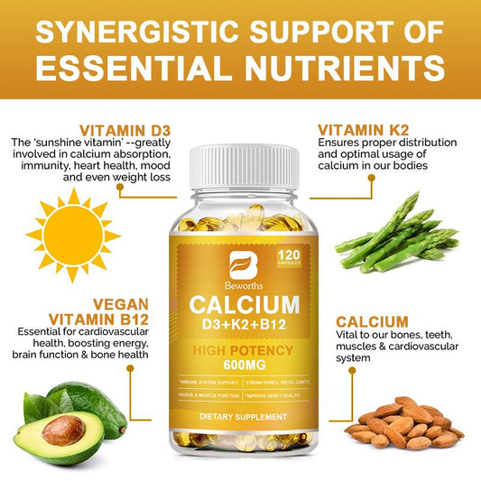 Beworths 4-in-1 Calcium 600Mg with Vitamin D3 K2 B12 Capsules for Bone Strength, Heart Health & Immune Support, 240 Capsules for Men and Women