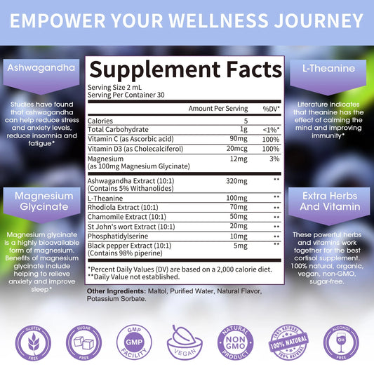 Cortisol Health Supplement, 10-in-1 Cortisol Manager, with Magnesium, Ashwagandha, L-Theanine, Supports Relaxation & Sleep, 2 fl oz