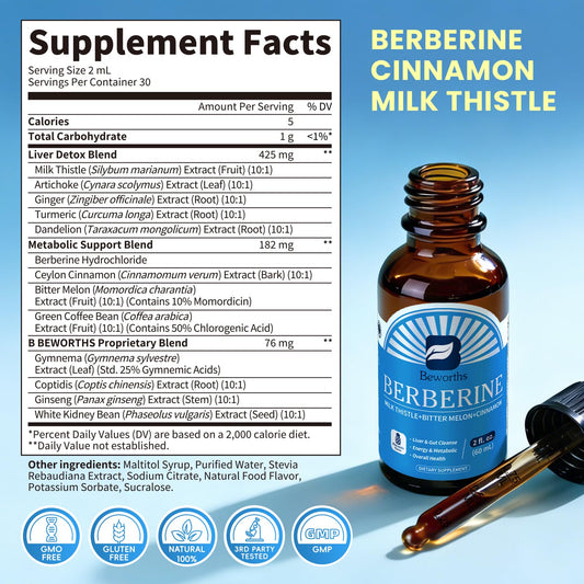 B BEWORTHS Berberine Liquid Drops with Ceylon Cinnamon & Turmeric - 12-in-1 Complex for Digestive Health, Immune Support & Gut Wellness - Organic Berberine HCl, Bitter Melon, Milk Thistle - Vegan & Non-GMO - 2 fl oz