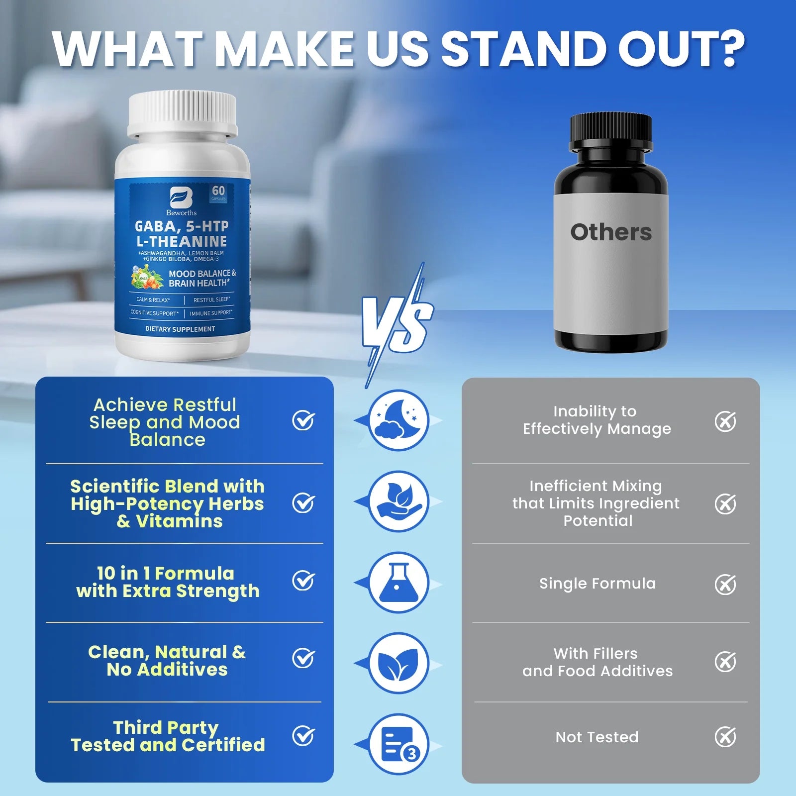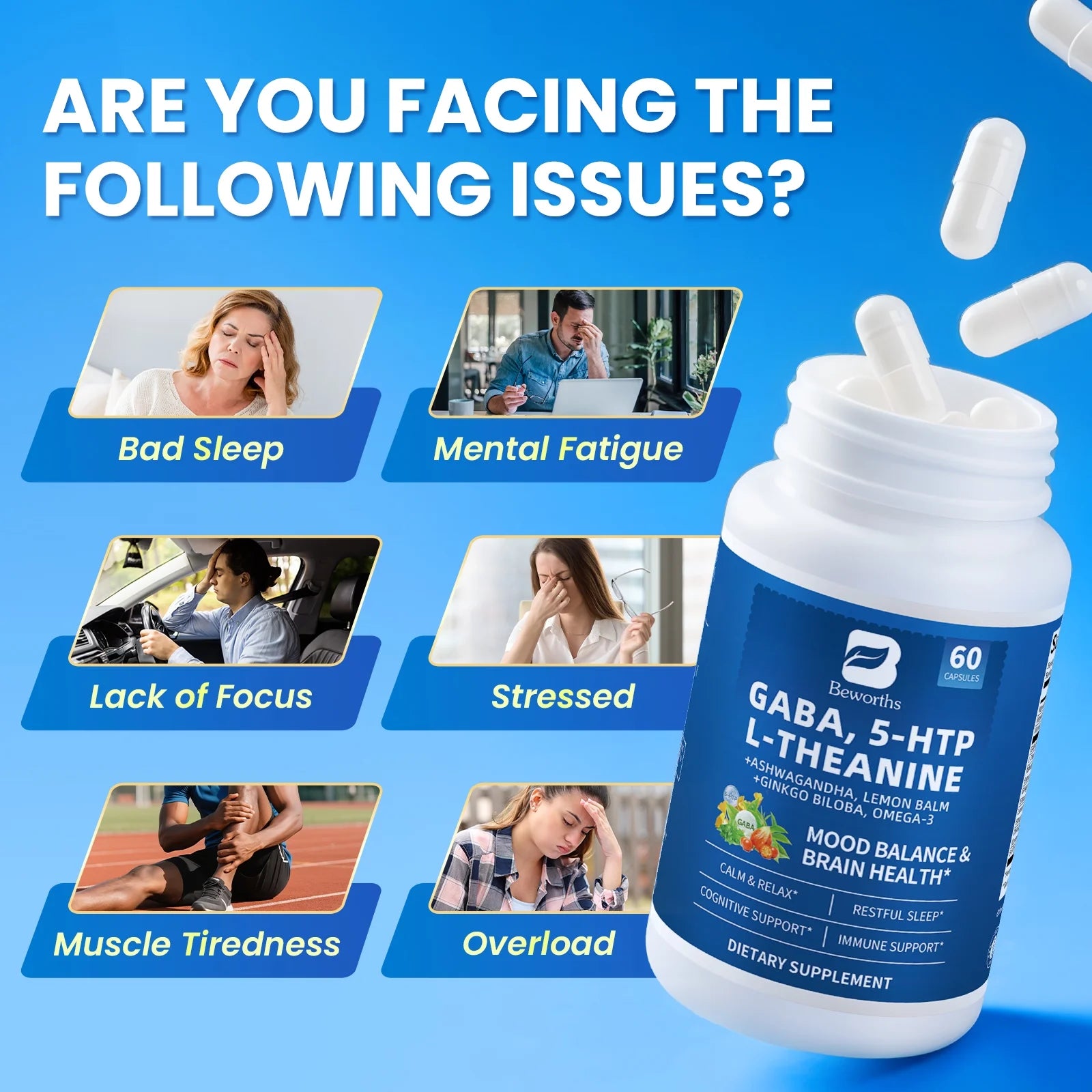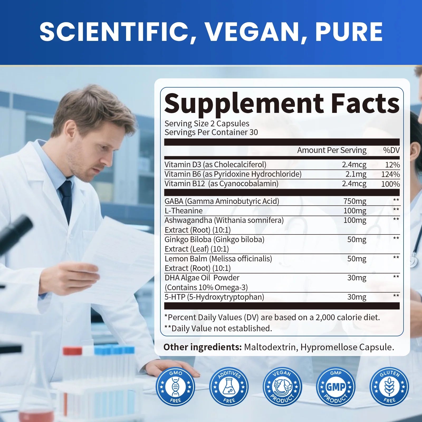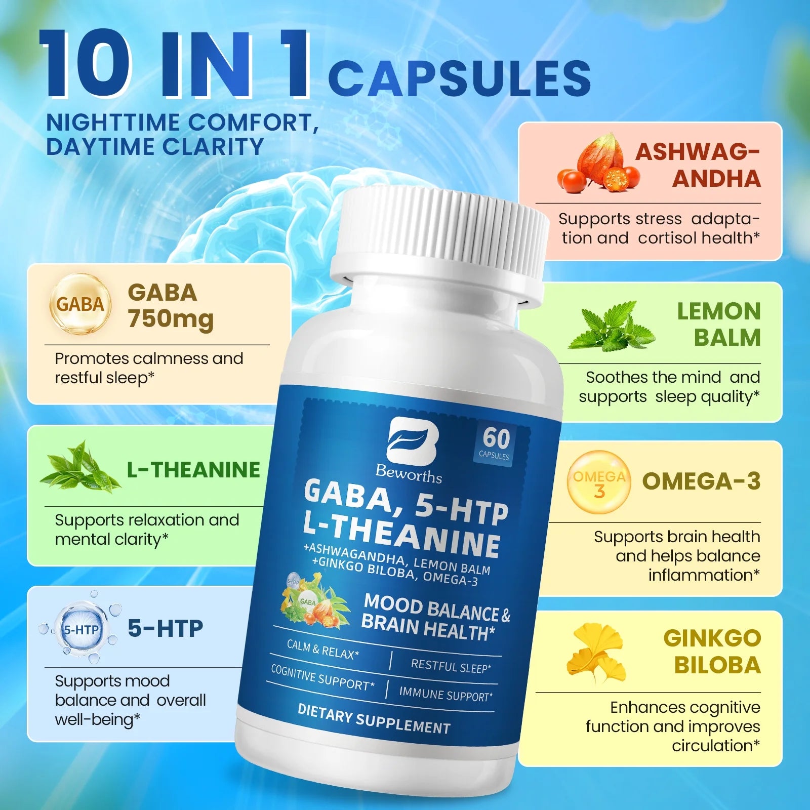(2 Pack) GABA 5 HTP L-Theanine + Ashwagandha + Lemon Balm & Ginkgo Biloba, Support Calm, Sleep, Mood Balance, 60 Pills
