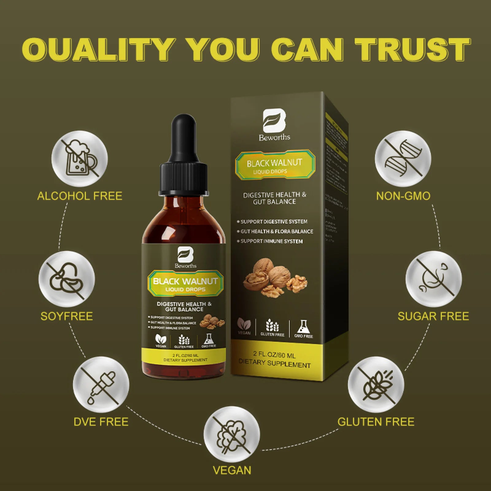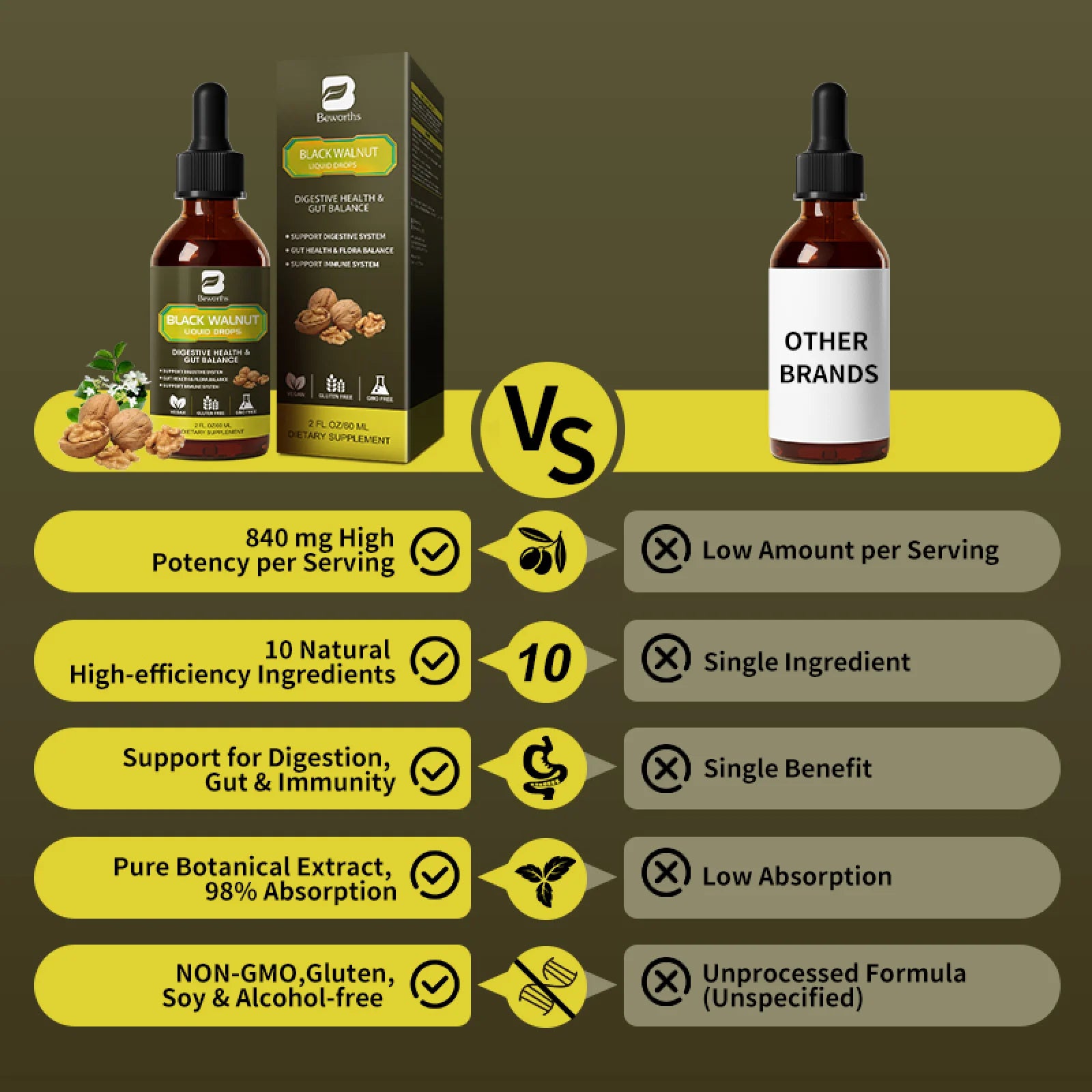 Black Walnut Liquid Drops, 10-In-1 with Wormwood, Pumpkin Seed, Garlic, Oregano, Berberine, Soursop, for Immune, Gut & Digestive Health Support, 2 fl oz