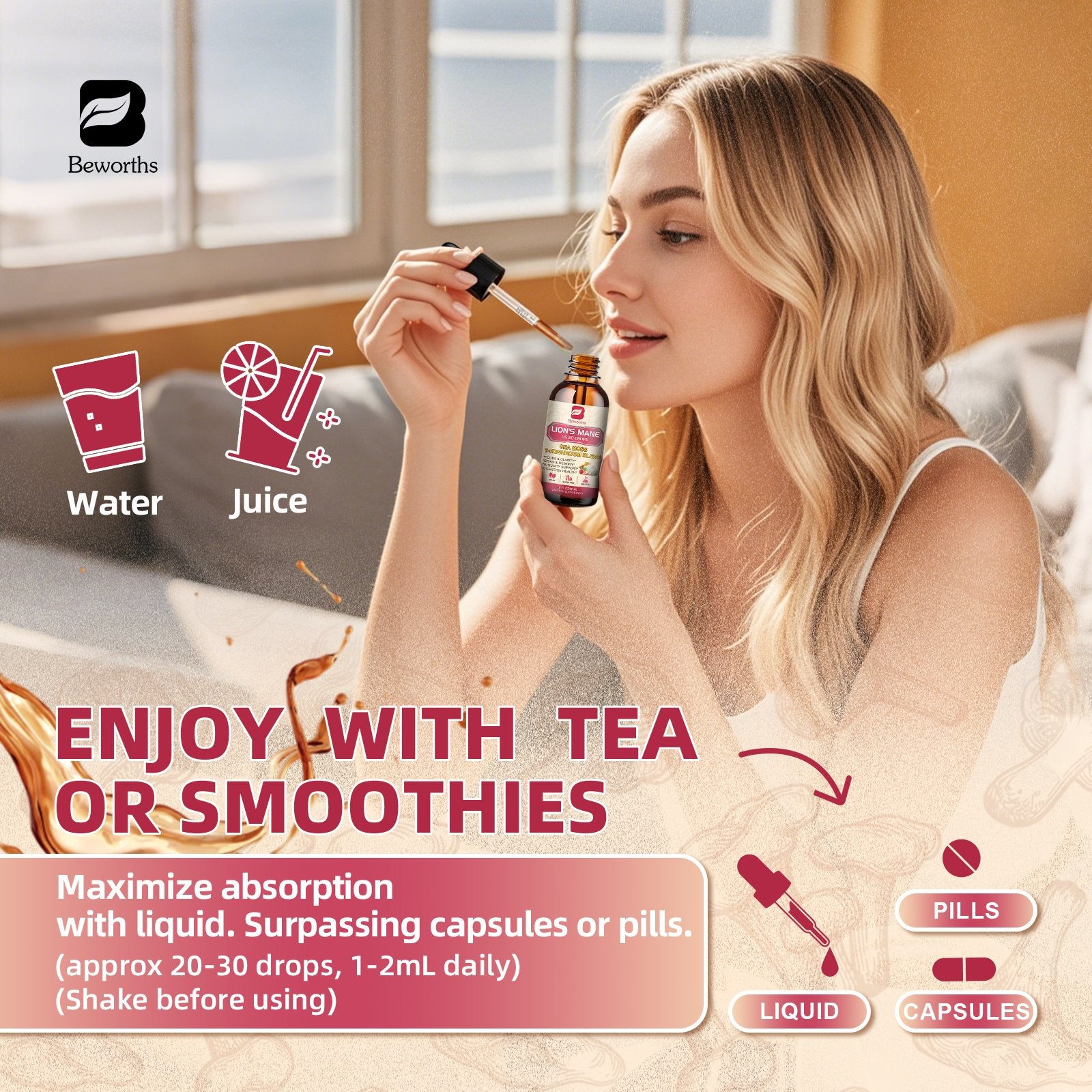 - ¡¾EASY TO TAKE¡¿: Sea Moss Lion's Mane Mushroom complex extract comes in a convenient liquid form, making it more effective than powder. Just take 1ml (20-30 drops ) daily, taken directly by mouth, or can be added to salad, coffee, tea, juice, smoothie, and shakes.Each bottle provides a 60-day supply when taken per day.