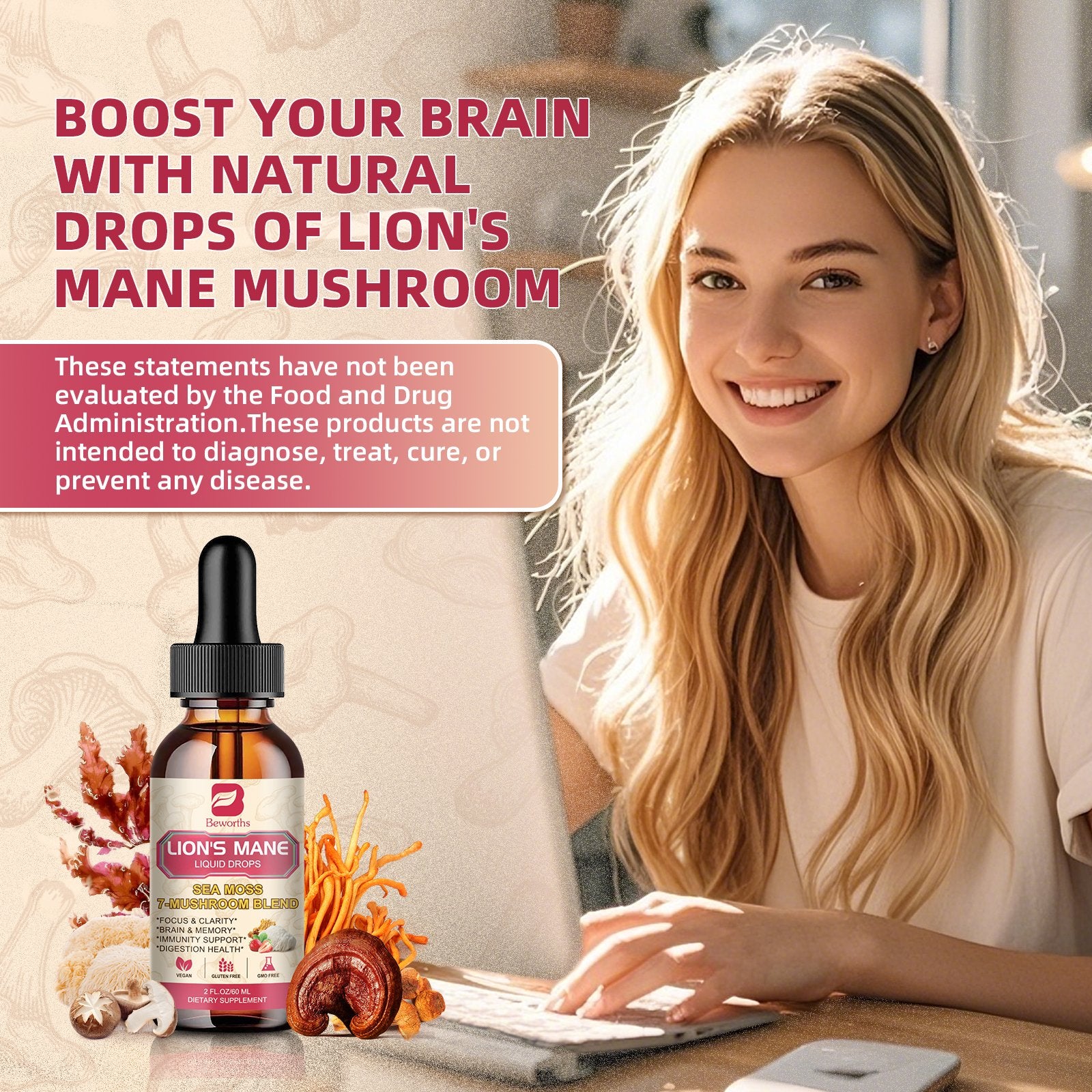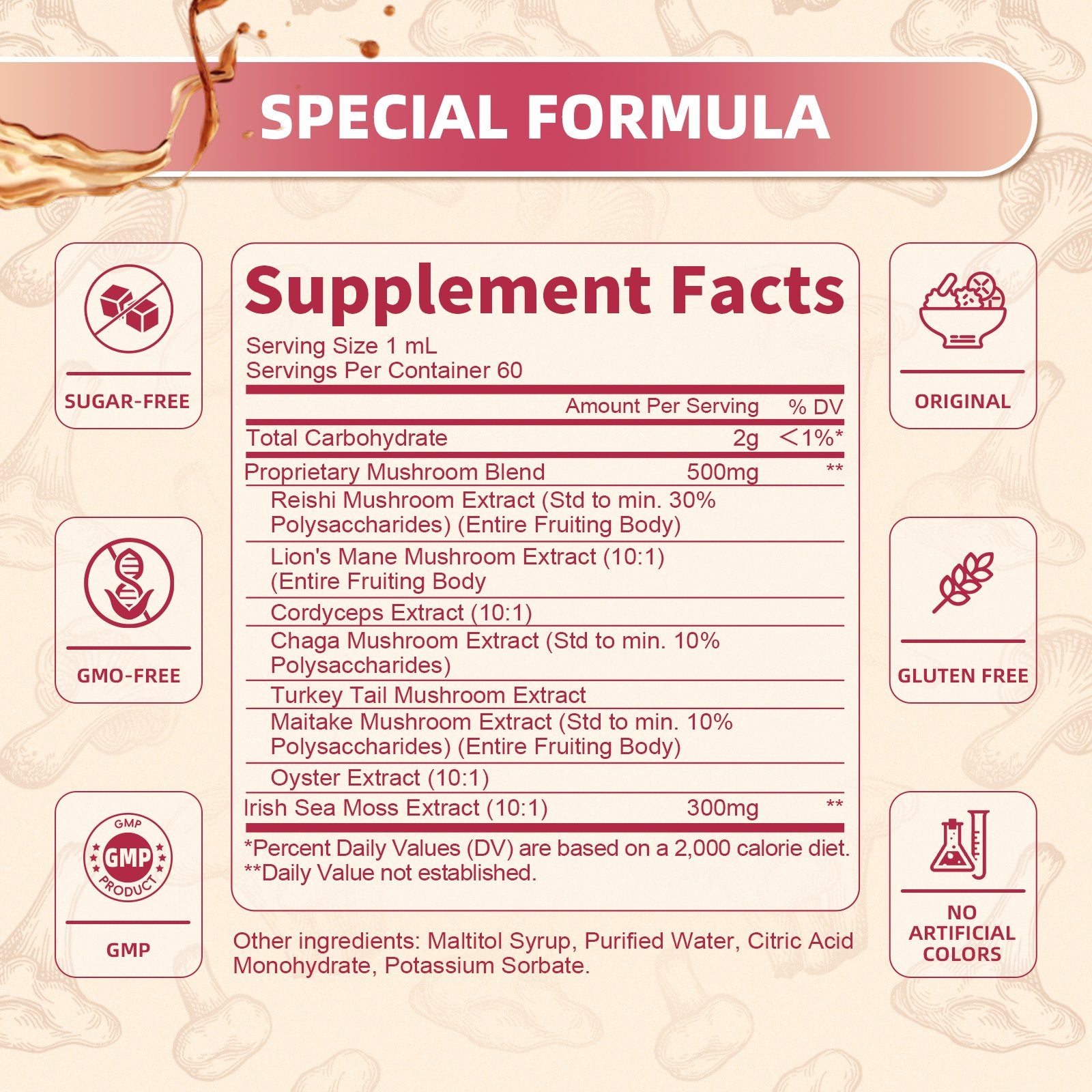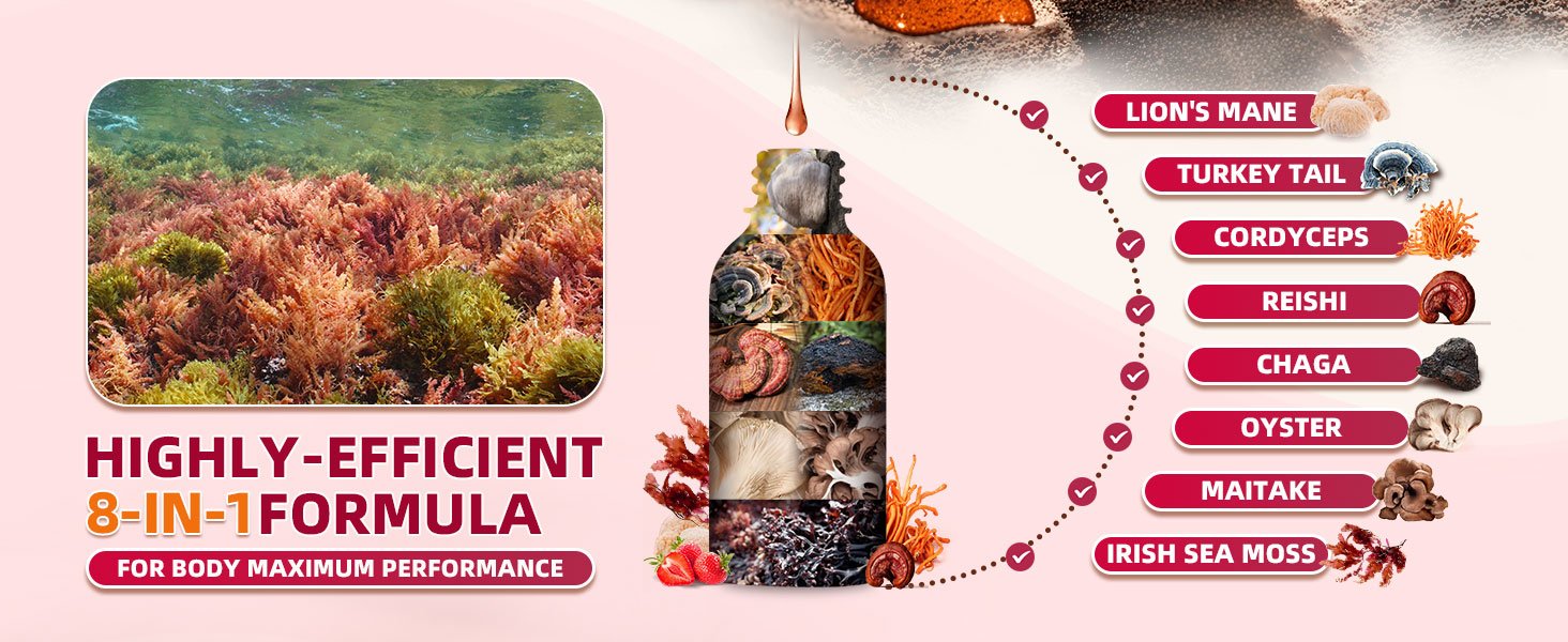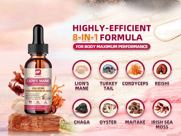 - ¡¾POWERFUL SEA MOSS MUSHROOM COMPLEX LIQUID DROPS¡¿- Lion's Mane mushroom liquid drops combined with premium Irish sea moss contain a potent blend of 7 organic mushroom extracts, including Lion's Mane, Chaga, Reishi, and Cordyceps, Turkey Tail, Maitake mushroom supplement, which supports immune, brain focus, memory, antioxidant*, and mood*. Experience the cognition benefits of this powerful Lions Mane supplement and enjoy even more wellness benefits.