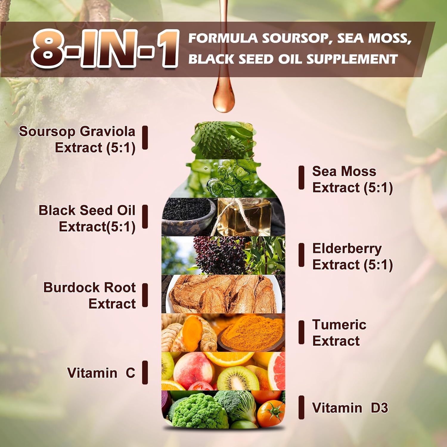 🌿 Premium Botanical Blend featuring Soursop, Irish Sea Moss, Black Seed Oil, Elderberry, Turmeric, Vitamin C & D3
